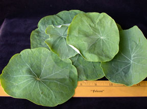 Edible flowers have become increasingly popular over the past few years. Nasturtiums are favored for their peppery flavor and bright color. NASTURTIUM LEAVES offer that same peppery flavor with a whole different look. Use them to brighten up the flavor in a green salad. Try spreading NASTURTIUM LEAVES with an herbed goat cheese or marscapone mixture…fold them into quarters, drizzle with an herby vinagrette, and serve as a first course. Add some welcome flavor to tea sandwiches with NASTURTIUM LEAVES. In addition to all their flavorful attributes, they are perfect for presentation because they lie flat, ready to make any plate more appealing.
